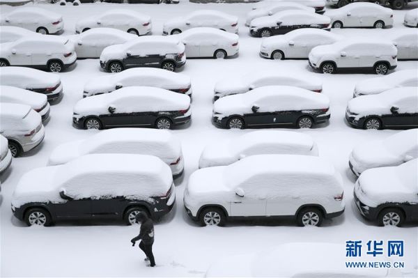 12月17日,一名市民走过哈尔滨市会展中心体育场附近的停车场。 当日,雪后的哈尔滨呈现出别样的景致。 新华社发