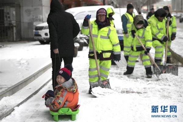 12月17日,在哈尔滨市南岗区南直路,环卫工人在街头清扫积雪,一名家长拉着坐在爬犁上的孩子从旁边经过。 当日,雪后的哈尔滨呈现出别样的景致。 新华社发