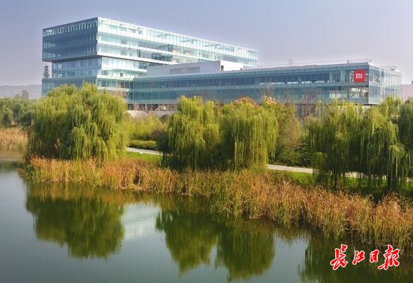 小米武汉总部大楼与东湖高新区政务服务中心湖水相连,在岸边柳枝的倒影映衬下,增添了无限风致