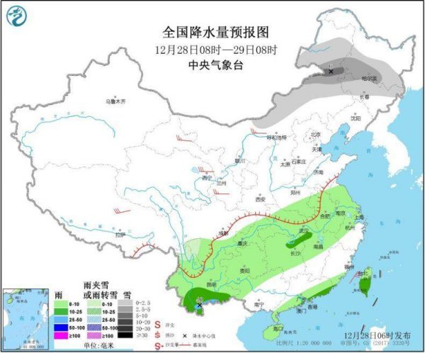 中央气象台预计,今天,内蒙古中东部、黑龙江中南部、吉林西部和中北部等地部分地区有小雪;其中,内蒙古东北部、黑龙江西南部、吉林西北部等地部分地区有中到大雪(5~6毫米)。黄淮中南部、江淮、江汉、江南中北部和西部、西南地区东部和南部、华南南部和西北部、台湾等地部分地区有小到中雨,其中,云南南部等地部分地区有大雨(25~40毫米)。