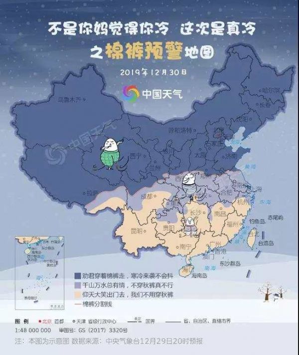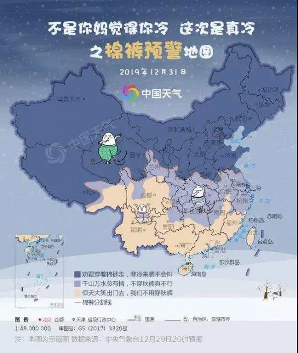 黑龙江、吉林、辽宁、内蒙古、河北、北京、天津、山东、河南北部、山西大部、陕西北部、甘肃大部、宁夏、青海、新疆、西藏西部和中部的小伙伴都需要穿着棉裤走;