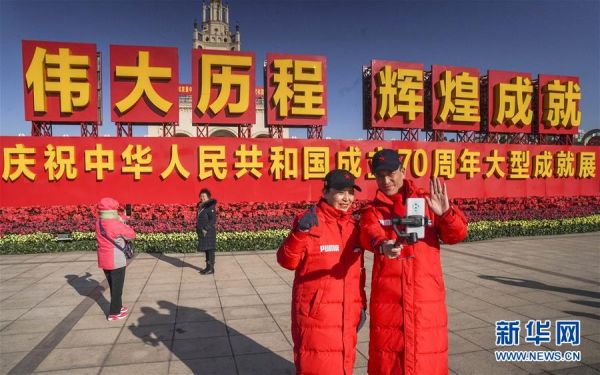 12月31日,参观者在庆祝中华人民共和国成立70周年大型成就展门前留影。新华社记者 殷刚 摄