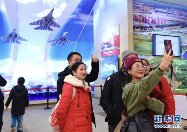 12月31日,参观者在庆祝中华人民共和国成立70周年大型成就展展厅内自拍。新华社记者 张玉薇 摄