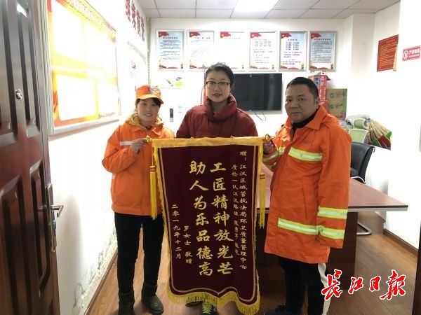 长江日报-长江网1月1日讯 近日,市民罗女士因一时疏忽,不慎将贵重的红宝石耳钉连同纸巾一起扔进了果皮箱,江汉路环卫工人帮她翻找多个垃圾袋后,终于找到了丢失的耳钉。昨日,罗女士特地送来一面锦旗,向环卫工人表示感谢。