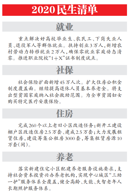 民生保障精准兜底:重点解决好高校毕业生、农民工、下岗失业人员、退役军人等群体就业,扶持创业3万人;精准推进全民参保,社会保险扩面新增45万人次;稳步提高城乡低保、特困供养人员等社会救助保障标准,将支出型贫困家庭纳入社会救助范围;
