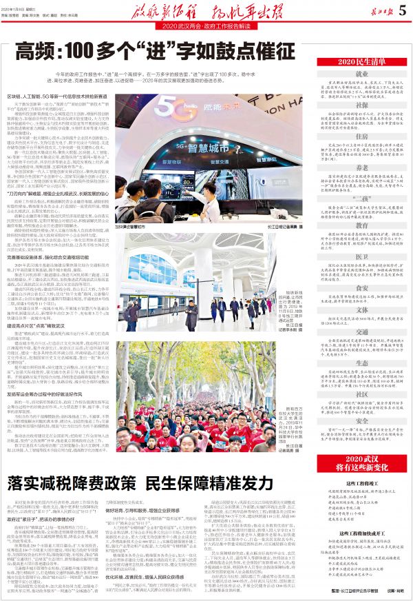 长江日报-长江网讯 今年的政府工作报告中,“进”是一个高频字。在一万多字的报告里,“进”字出现了100多次。稳中求进、高位求进、克难奋进、加压奋进、以进促稳……2020年的武汉展现更加强劲的奋进态势。