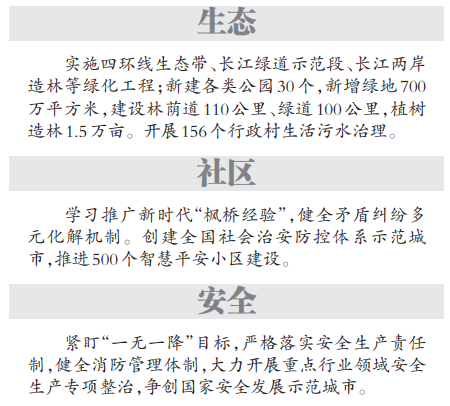 绿道公园要变大:巩固长江汉江岸线资源优化调整成果,落实长江全面禁渔工作部署;实施四环线生态带、长江绿道示范段、长江两岸造林等绿化工程;新建各类公园30个,新增绿地700万平方米,建设林荫道110公里、绿道100公里,植树造林1.5万亩。