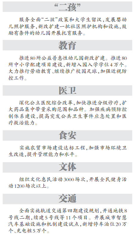 扩大优质公共服务供给:推动义务教育优质扩容,推进80所中小学配建项目建设,新增入园入学学位4万个;推进医养结合,改善老年人健康养老服务;加快建设国家医疗卫生服务中心,打造一批名医名院名专科,扩大药品集中带量采购范围和品种,切实减轻群众看病负担。