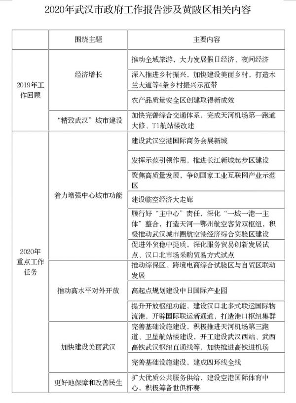 政府工作报告中,2019年工作回顾,从经济增长和“精致武汉”城市建设等方面涉及黄陂发展亮点,2020年重点工作任务主要从着力增强中心城市功能、推动高水平对外开放、加快建设美丽武汉、更好地保障和改善民生等多方面涉及黄陂重点工作部署。尤其对报告中关于“打造天河——鄂州航空客货双枢纽,积极推动武汉城市圈航空港经济综合实验区建设”以及“建设武汉空港国际商务会展新城”等相关表述,黄陂区代表团展开了热烈讨论,代表们就发展临空经济、建设空港新城等纷纷建言献策。