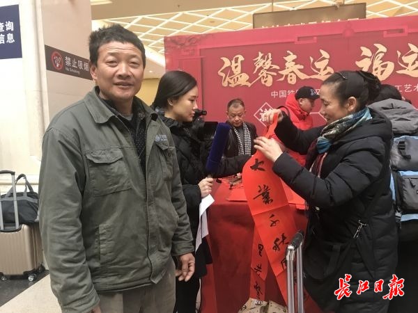 在汉口火车站二楼,开展了送春联活动,六位书法家现场写春联赠送给旅客。今年50岁的李家宏准备搭车从汉口站前往襄阳,他笑容满面地告诉记者,自己在武汉工作,今天刚刚放假,一早就赶来汉口站乘车,他拿着刚获赠的一副春联,准备带回家挂在家里。