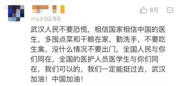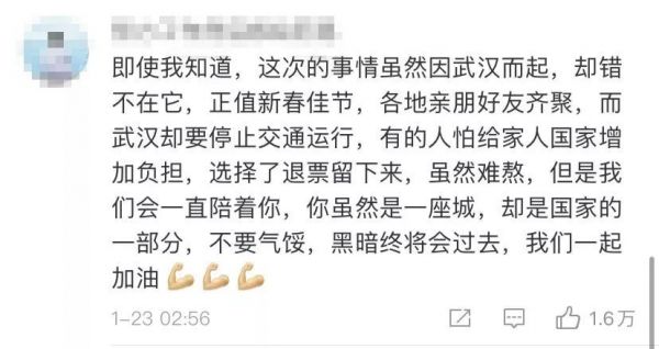 @sunny:武汉加油!也希望政府做好物资保障工作,安排好武汉人最基本的生活!在其他平台和媒体留言区全国各地网友也留下了暖心评论愿与武汉携手共进,渡过难关齐刷刷为武汉加油