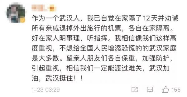 @Ivy:时刻都在关注,国家和人民经历了非典时期,现在依旧相信武汉能渡过难关,各行各业冲在一线的英雄们,大家辛苦了!武汉加油!国家加油!