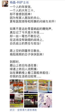 24日晚,湖北省中医院派出驰援金银潭医院的护士长杨晶吃完自己特殊的年夜饭。当天晚上,她收到了热心市民送来的蛋糕,和省中医院给支援医护人员送来的补给餐。她在朋友圈里写道,“一个人的年夜饭,一个人的大年三十,却不曾感到孤单,因为有家人朋友的关心,更有医院领导和同事们的问候与关怀……”