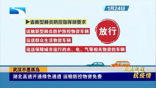 目前进出武汉的40多个高速公路收费站实施了交通管制,如何保障运输防控物资的车辆能够顺利进入武汉成为大家关心的问题。24号,省交通运输厅下发通知,根据省新型肺炎防控指挥部要求,即日起,对运输新型肺炎防护防控物资车辆、运送群众生活物资车辆以及运送保障城市运行的水、电、气等相关物资的车辆予以放行,其中,运输新型肺炎防护防控物资车辆通行湖北高速公路一律免费。