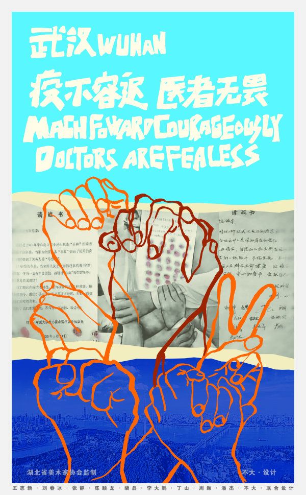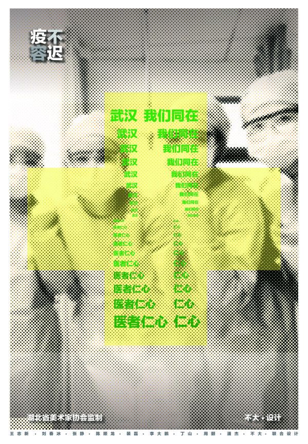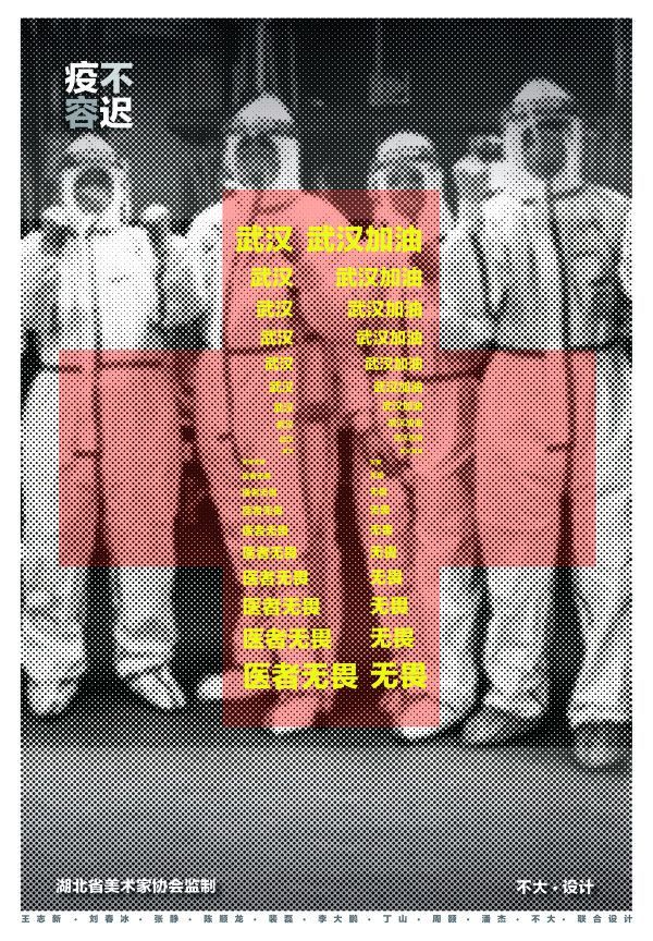 由王志新、刘春冰、张静、陈顺龙等20余艺术家参与创作的作品围绕“疫·不容迟”和“医·无反顾”两个主题,以奋战在抗疫一线的医护人员、全国各地驰援武汉的医生、医生请战书、最美逆行者的新闻图片为主题,通过“武汉,我们同在”“武汉,你不孤单”“心手相牵,医者大爱”等朴实感人的文字点睛,致敬城市英雄。艺术家还以动画短片的形式,普及防疫常识,如勤洗手勿揉眼睛,网络拜年少聚会,吃熟食禁止野味等。