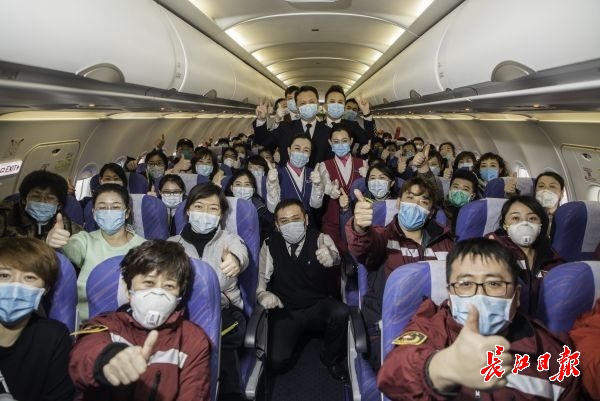东航当天3架包机的机组成员中,绝大多数是共产党员,他们主动请战护航“最美逆行者”。执行太原-武汉包机的机长伍建明已经是第二次执行这样特殊航班任务了,他在机长广播里说道:“今天我送你们去战斗,待到胜利时,我接你们共回家!”乘务组还把省下来的一次性手套现场支援了医护人员。执行南京到武汉包机任务的10名机组成员均为党员,他们表示哪里有需要就往哪里飞,不辱使命。