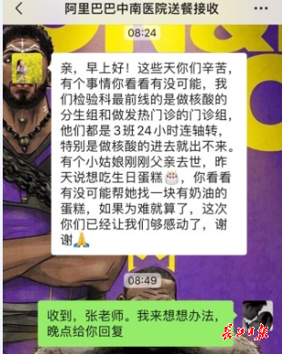 长江日报-长江网2月5日讯(记者张珺)“早上好,今天送饭来的时候能带块蛋糕吗?”2月4日一大早,饿了么负责武汉大学中南医院爱心餐配送的骑手站站长李浩洁的手机上收到一份特殊订单。