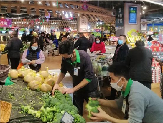 华润集团旗下华润万家、华润五丰等在疫情发生后第一时间发布公告,郑重承诺“不涨价、保供应”。华润万家为了保证基本消费不受影响,全国三千多家门店日平均工作人数超10万人次,目前华润万家已采购口罩超1715万元,纯消毒品(水、液、酒精)2273万元,粮油米面210000万元,方便食品54700万元,常温奶122000万元,果蔬99143万元,肉蛋鱼142600万元,确保满足全国各门店的生鲜供应,并宣布免除全国各门店招商租户春节期间的租金。为商品保供及服务需求提供坚实的保障。