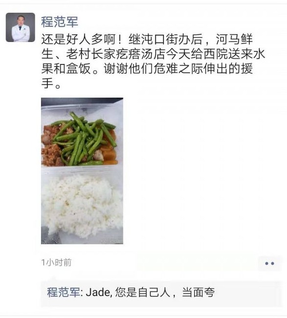 每天,沌口“村长家的疙瘩汤”餐馆经理王菲的手机微信上都会出现这样的对话。从1月27日开始,这家餐馆每天都会做出100份左右可口的饭菜,免费提供给协和医院西院、东苑医院、汉洪公安检查站等抗疫一线人员,协和西院院长程范军专门为此发朋友圈表达感谢。