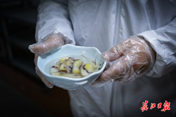 今天是元宵佳节,后厨的师傅们特意为浙江医疗队准备了银耳汤圆,湖北特色点心小面窝和手工特制的“雨花石汤圆”。