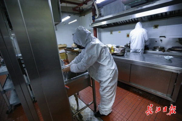 2020年2月8日,武汉鑫宝来酒店。为保证食品安全,每位工作人员进入后厨操作间前都进行了严格消杀。所有后厨工作人员全员戴口罩,一次性手套,着防护服进行作业。