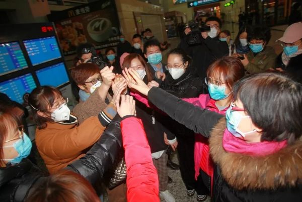 在武汉天河机场,来自齐鲁医院和华西医院的两支队伍相遇,相互加油。他们将共同接管武汉大学人民医院东院区。