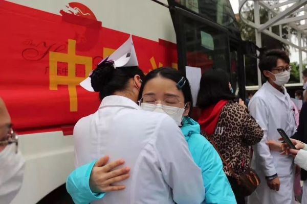 复旦大学中山医院医疗队成员和家人告别。