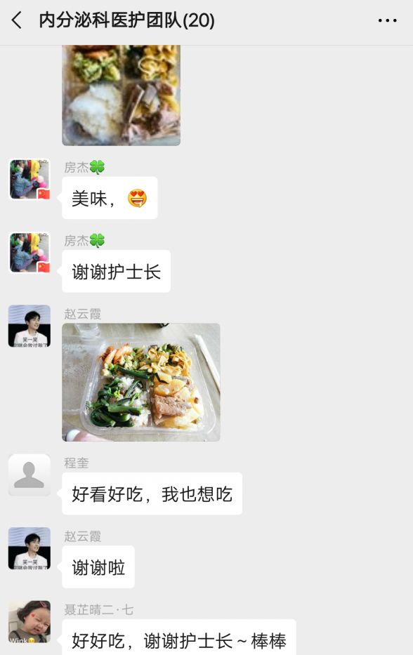 “太美味了”、“好好吃啊”、“护士长棒棒的”……吃到冯岳湘亲手做的饭菜后,同事们纷纷在微信群里表示感谢。呼吸七区的刘俊、代妮告诉长江日报-长江网记者,在一线工作,每个人都很疲惫,没想到,护士长居然在下班后还抽时间熬汤、做饭,让大家感觉特别温暖,刘俊直接“表白”说,“你是我一辈子的好护士长,我永远爱你!”这样的感谢冯岳湘收到了很多,她解释,自己家离医院很近,来回比其他同事方便,收到大家的感谢后,她反而有些不好意思。