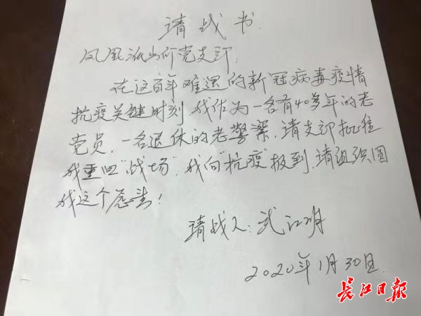 1月30日上午,武江明主动来到原工作单位青山公安分局凤凰派出所,向支部递上一份请战书,“……我作为一名有40多年党龄的老党员、一名退休的老警察,请支部批准我重回“战场”,请组织圆我这个愿望!”在武江明再三要求下,支部领导同意他以一名治安积极分子的身份,与其他民警一道参与社区入户调查和运送病患的工作。