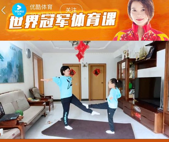 世界冠军莫慧兰通过优酷直播在家教孩子上体育课