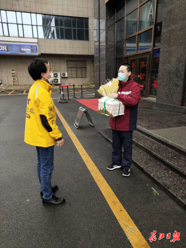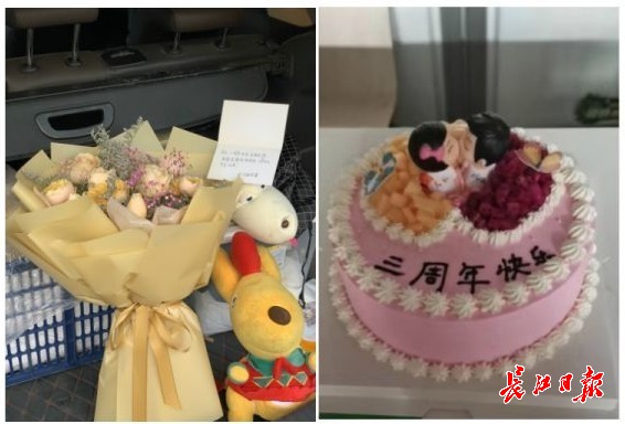 长江日报-长江网2月14日讯(记者章胜)2月14日上午,武汉某酒店,正在休息的四川广元市援鄂医疗队队员李澍森,收到了一份特殊的外卖——远在广元的妻子杨敏珥,在武汉给他订了一束鲜花和一个蛋糕,并附赠一张卡片,上面写道:“老公,三周年纪念日快乐呀!希望疫情快快结束,你可以平安归来。爱你的老婆。”