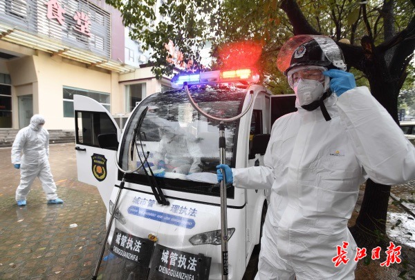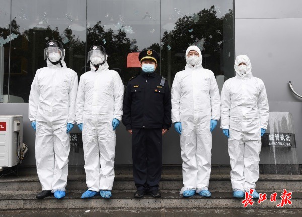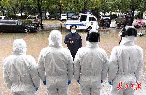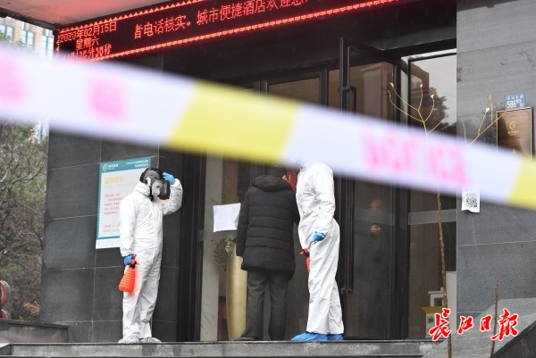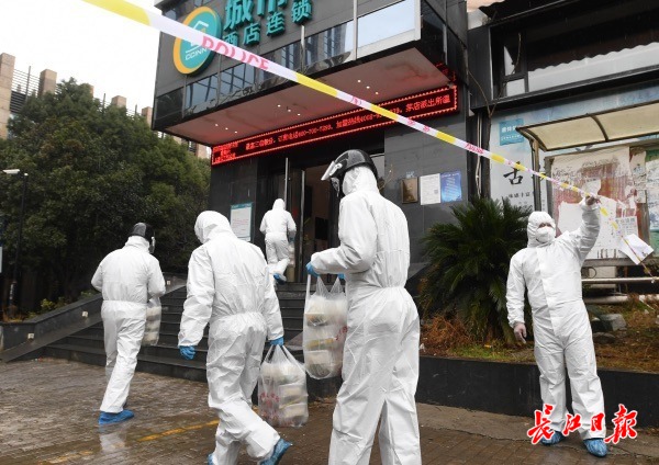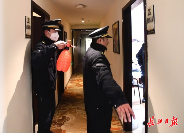 长江日报-长江网2月16日讯 2月15日11时许,东湖高新区光谷软件园路上的城市便捷酒店门前,关东街道步行街城管执法中队副队长邓磊和他的四名同事正在风雨中值守,一批做完核酸检测的新冠肺炎疑似患者马上要回酒店,队员们做好现场接车和消毒准备。