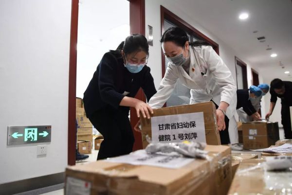 2月15日,甘肃省妇幼保健院医护人员整理打包支援湖北的医用物资。