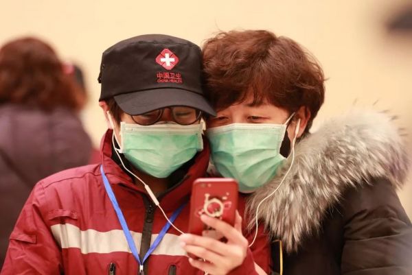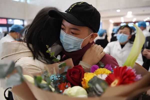 2月15日,甘肃省妇幼保健院一名医护人员(前右)在出征前与同事拥抱告别。当日,甘肃省第三批援助湖北医疗队从兰州奔赴武汉。