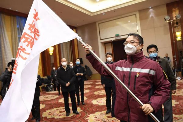 1月28日,甘肃医疗救治队队长蔡辉(前)在出发仪式上接过医疗救治队队旗。当日,由甘肃省卫生健康委组建的甘肃医疗救治队从甘肃兰州启程奔赴湖北武汉,支援湖北新型冠状病毒感染的肺炎疫情防控和救治工作。