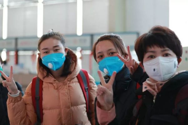 1月28日,在兰州中川国际机场,甘肃医疗救治队的医护人员对镜头比出胜利手势。