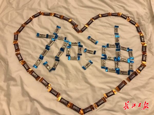 2月14日,张瑾与同事用巧克力拼出爱心图案,为武汉加油。图片由张瑾提供