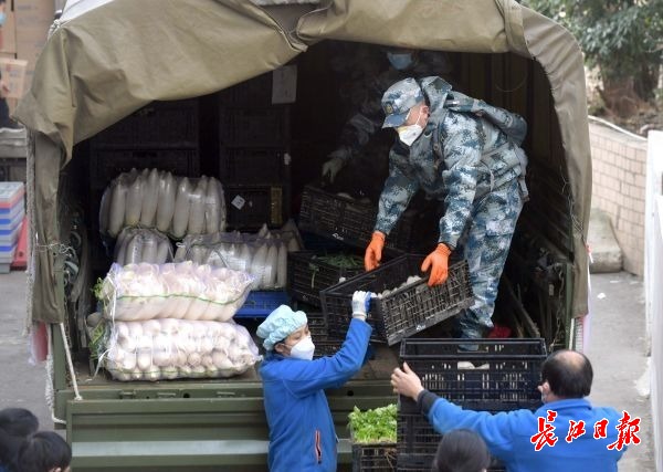 长江日报-长江网2月24日讯 2月23日上午,长江日报-长江网记者在武汉市武商惠济路店看到,驻鄂部队抗击疫情运力支援队一辆卡车将3吨多的蔬菜、水果送达后,该门店迅速为居民选配生活物资。