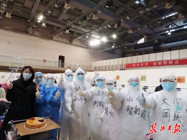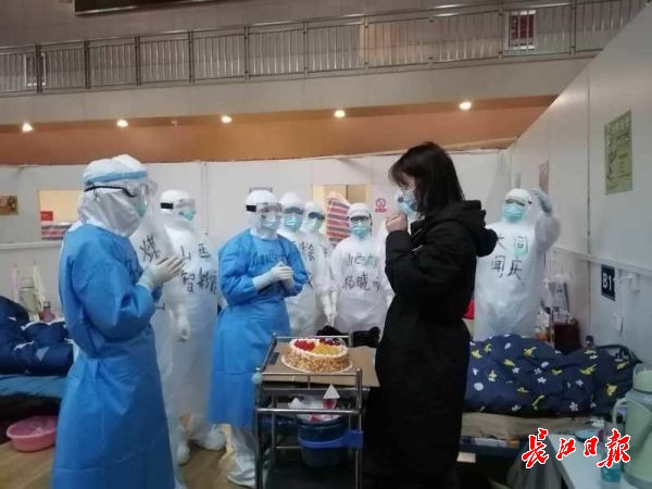 在硚口武体“方舱医院”,来自山西医疗队的医护人员为患者小慧过生日