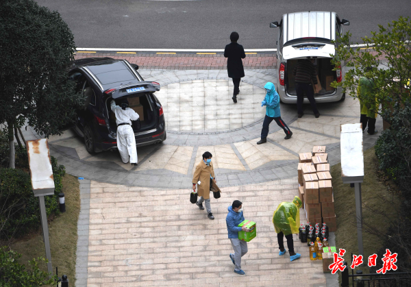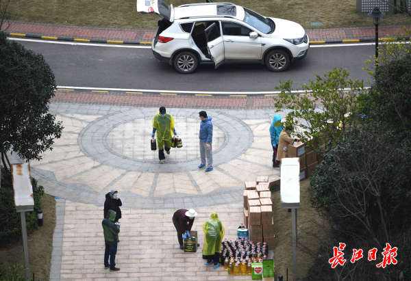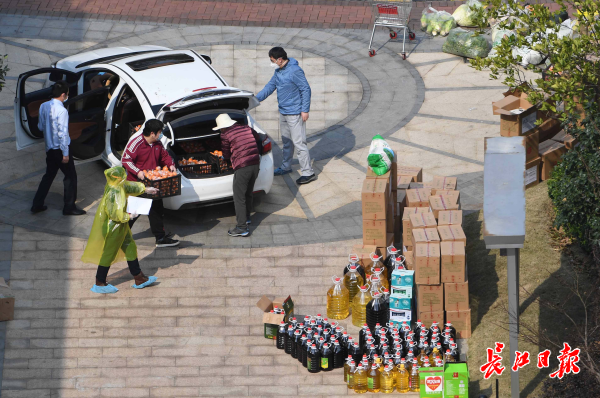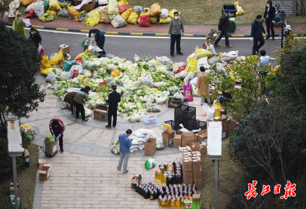 长江日报-长江网2月24日讯 2月24日下午4时许,一批捐赠的爱心蔬菜和水果粮油,经过5个多小时的转运送到洪山区关山口社区联投喻园小区,惠及二百余户居民。联投喻园小区物业接到受赠爱心物资通知后,组织号召员工和社区志愿者开出7辆私家车,到捐赠点领取物资,志愿者从上午10点半开始行动,发扬蚂蚁搬家精神来回奔跑运输,将6吨新鲜的蔬菜(大白菜、小白菜、萝卜、卷心菜等)和物资分发到居民手上。(记者高勇 摄影报道)