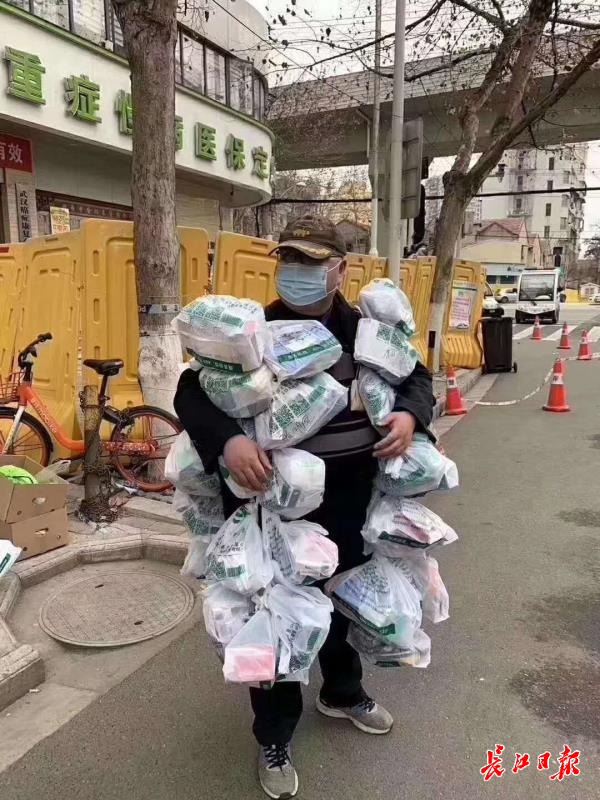 长江日报-长江网2月25日讯(记者李婷 通讯员刘文华)24日16:50左右,江岸区后湖街道惠民苑社区网格员丰枫和同事在药房拿到帮居民买的药,准备赶回社区。疫情防控以来,丰枫每天都要收集居民清单,为居民排队买药。当天,他和同事三人要取近90份居民所需的各种药品,带着两个箱子去装药,因箱子装不下,丰枫将其中的小份药串成两串挂身上。同行的志愿者给他拍下了这张照片。