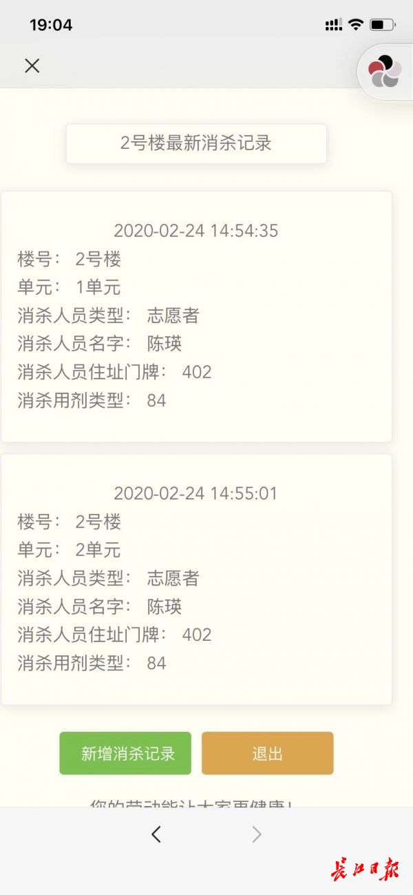 申二熬过一个通宵,开发出“我爱我家”小程序,让完成消杀作业的志愿者登录更新数据,所有业主可随时点阅。