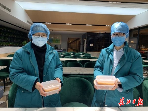 从方舱医院回到驻地的护士王翠(右)、杜莹莹在餐厅领到了胡辣汤和小龙虾。记者邓小龙 摄
