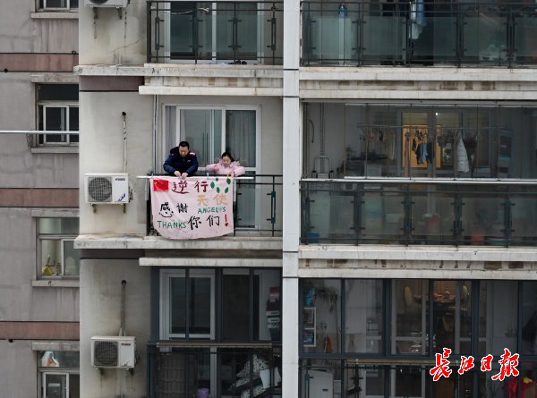 长江日报-长江网2月27日讯 2月26日,居住在江汉区东方名都小区的10岁小学生戴欣怡在爸爸戴江波、妈妈瞿灵玲的支持下,用床单做成“逆行天使,感谢你们”宣传横幅挂在阳台上,为入住在家对面阳光酒店的援汉内蒙古医护人员们加油。2月27日,从江汉方舱医院下班回到阳光酒店的医护人员们看到横幅十分激动,女护士边艳辉说:“中国人,一家人,共患难,见真情。”