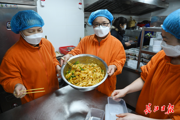 27日中午,江汉区援鄂医疗队后勤保障酒店——柏曼酒店的后厨端出了一碗碗热气腾腾的油泼面。