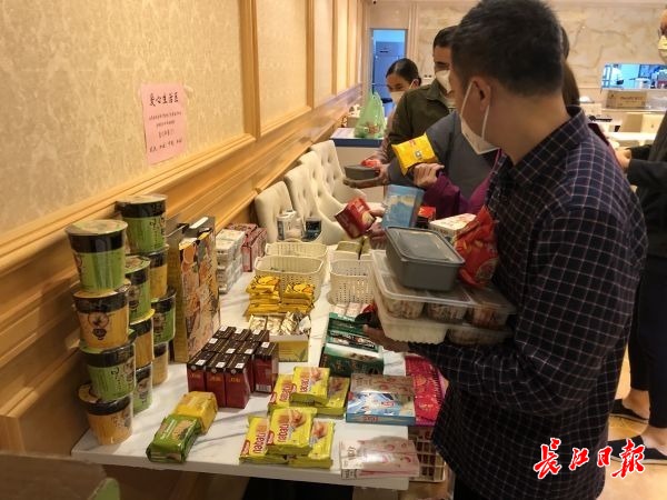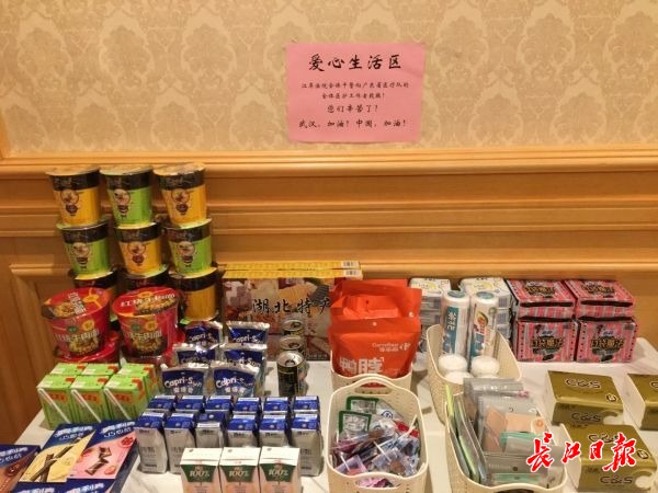 在该酒店的援汉广东医疗队共有148人,其中有90多名护士,女性成员较多。保障组入驻第一天,便在酒店餐厅旁开辟了“爱心生活区”,摆满了各种各样的生活用品,从湖北特产到酸奶、凉茶,从女性生理用品到发卡、面巾纸,供医疗队随需随取。后来,保障组又将工作地点搬到了“爱心生活区”一角。