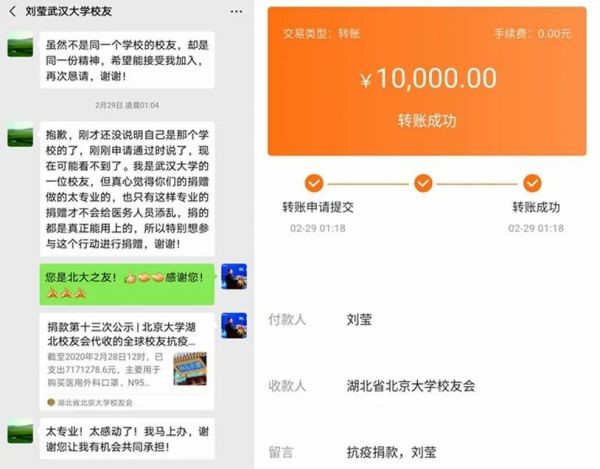 作为一名武汉大学校友,她还恳切地说:“虽然不是同一个学校的校友,却是同一份精神,希望能接受我加入,再次恳请,谢谢!”湖北校友会抗疫援助中心经研究,同意她作为“北大之友”参加到行动中来。她得知消息后非常高兴,马上向湖北省北京大学校友会代收专用账户转账10000元。“你们捐口罩太专业了!太感动了!”她对刘萌连连说到。