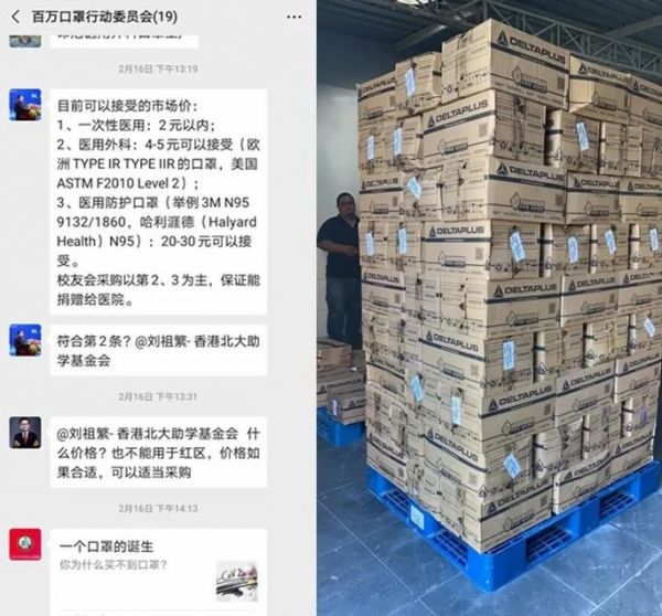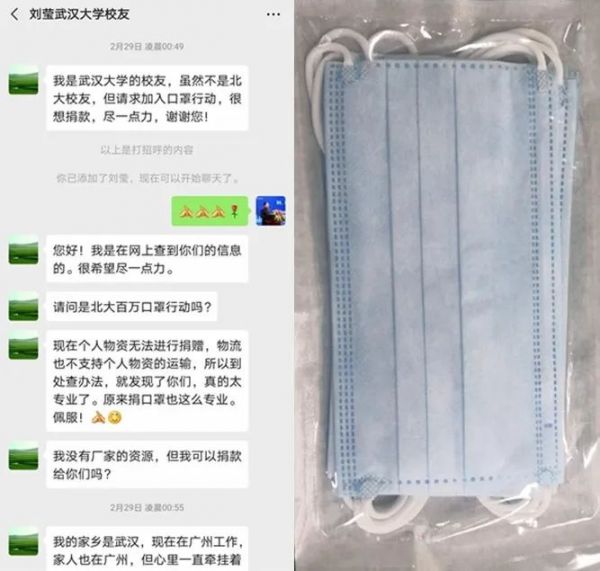 2月29日,武汉大学校友、在广州工作的刘女士与“百万口罩行动”委员会副主任、湖北省北京大学校友会会长刘萌联系。她说:“我仔细地在网上查看了你们捐口罩的信息,真心觉得你们的捐赠做的太专业了,所以特别想参与这个行动进行捐赠。”