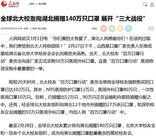 自2020年1月25日以来,湖北省北京大学校友会已代收近3万名校友和北大之友的捐款近1000万元。特别是2月8日北京大学校友会发起全球校友“百万口罩行动”后,行动委员会、北大海内外各校友组织、校友个人已采购和即将向湖北捐赠的口罩数量达到140万只,在国内外引起了热烈反响,各界人士纷纷为北大校友点赞。