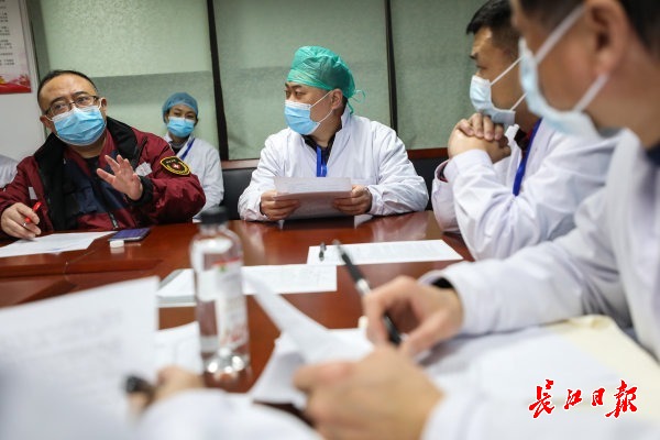 2020年2月23日,武汉红十字会医院病例讨论会上,四川省人民医院ICU主任黄晓波(左一)正在讨论救治方案